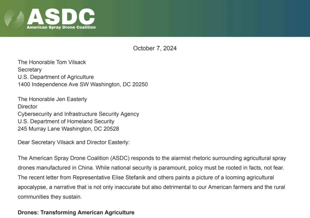 The American Spray Drone Coalition reached out to the Secretary of Agriculture, Tim Vilsack, with our thoughts on the potential legislation surrounding Chinese-manufactured drones. Read the letter to learn more.
