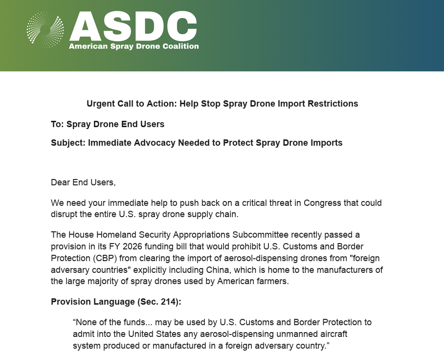 We need your immediate help to push back on a critical threat in Congress that could disrupt the entire U.S. spray drone supply chain. The House Homeland Security Appropriations Subcommittee recently passed a provision in its FY 2026 funding bill that would prohibit U.S. Customs and Border Protection (CBP) from clearing the import of aerosol-dispensing drones from “foreign adversary countries” explicitly including China, which is home to the manufacturers of the large majority of spray drones used by American farmers.